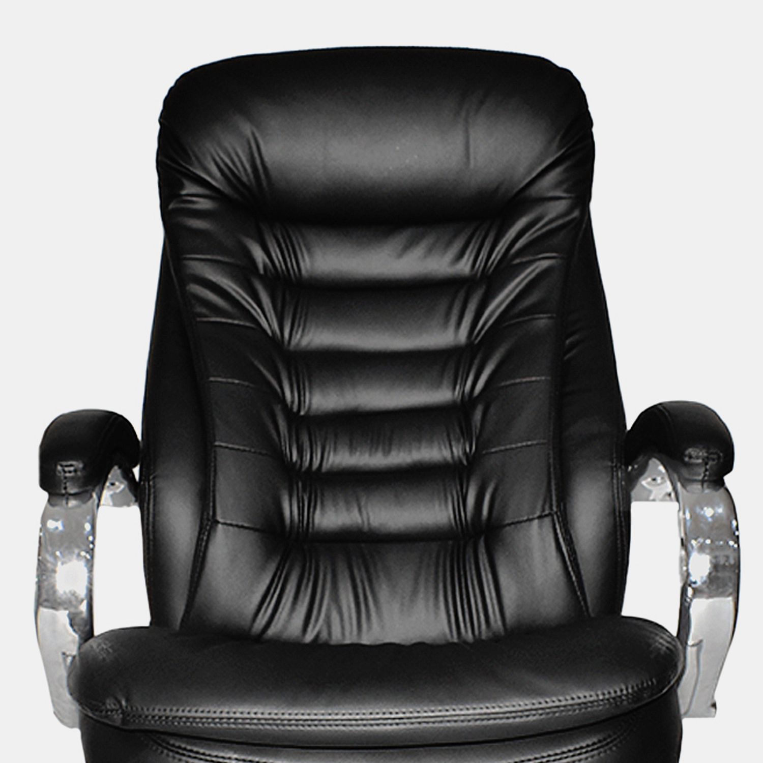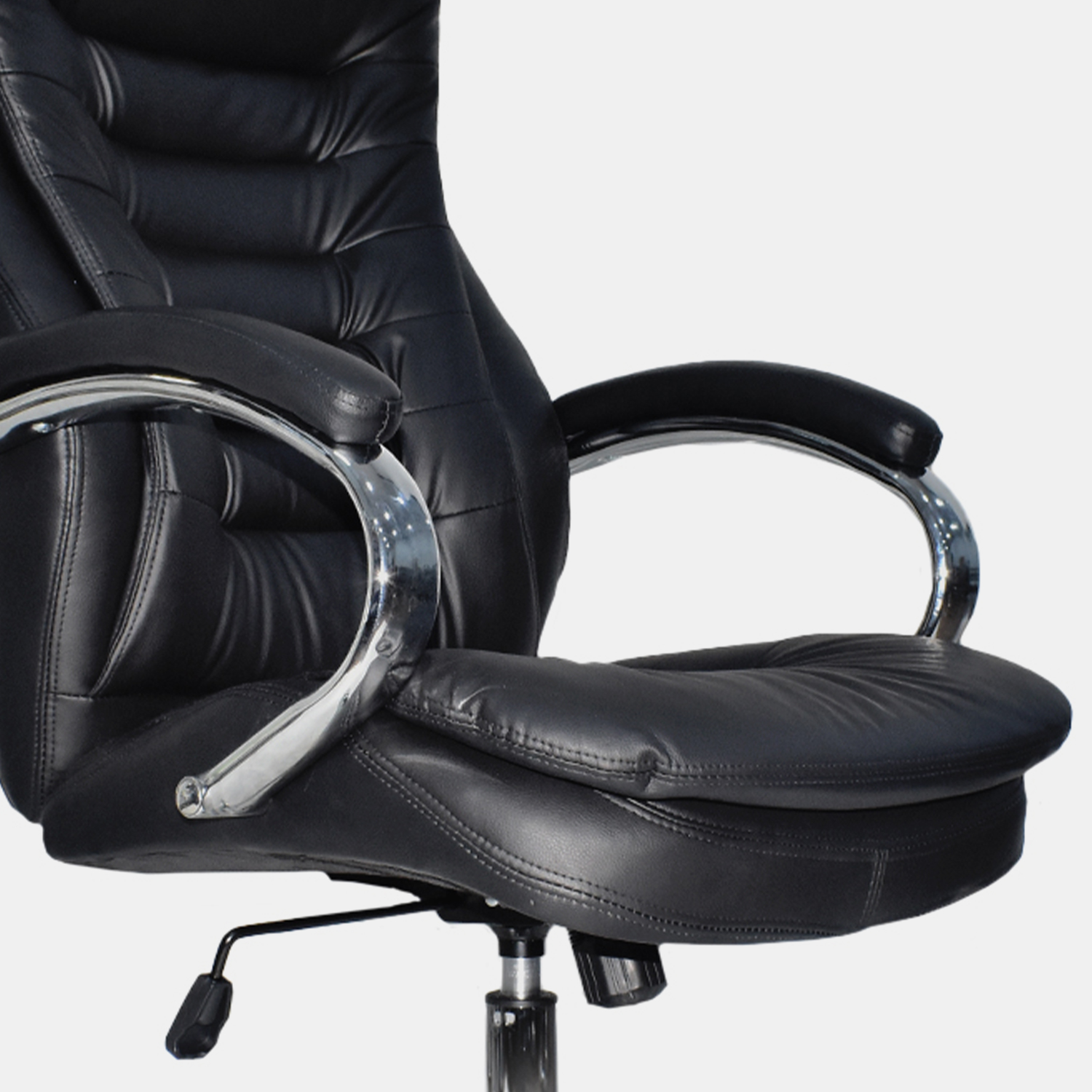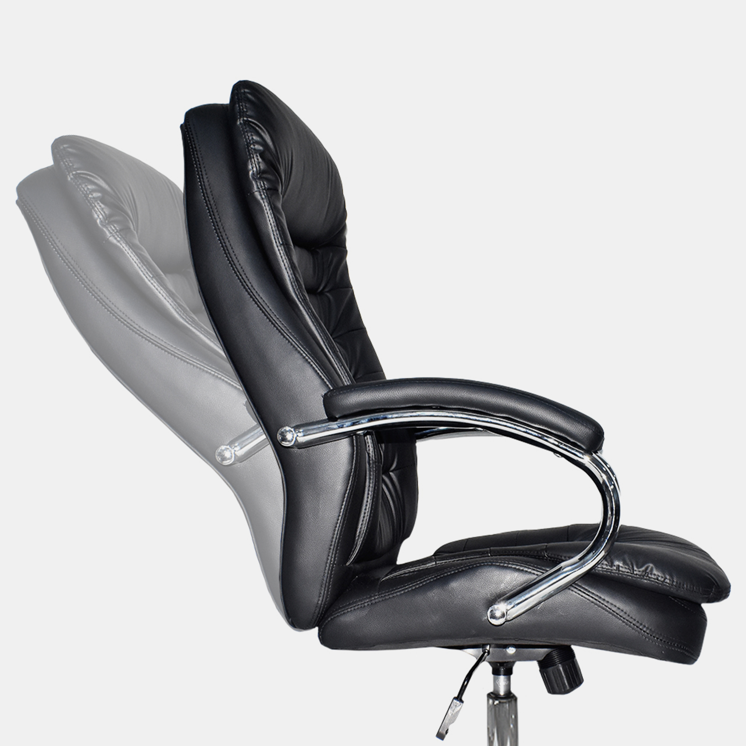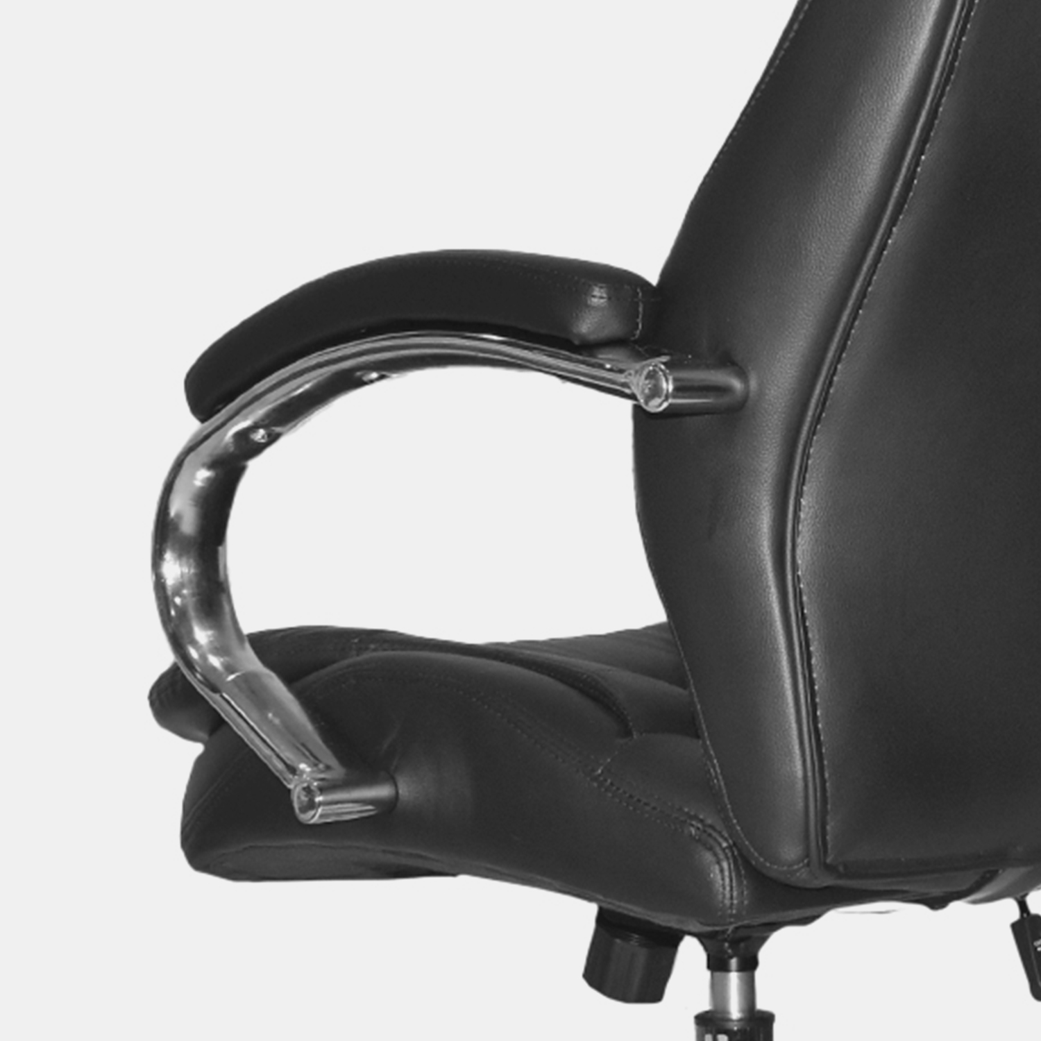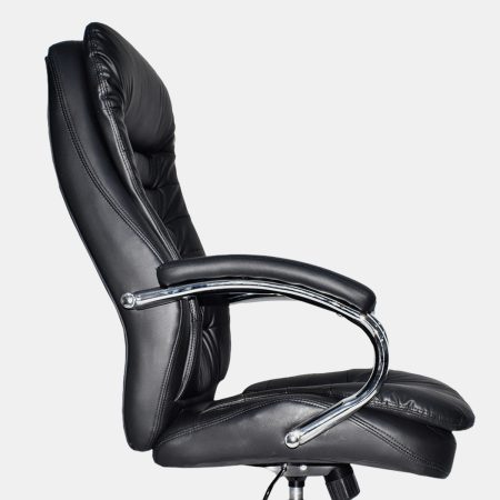 • Espaldar en cuero sintético • Brazos cromados con PAD en cuero sintético, fijos • Asiento en cuero sintético • Mecanismo basculante • Base cromada 320 mm • Ruedas nylon 50 mm