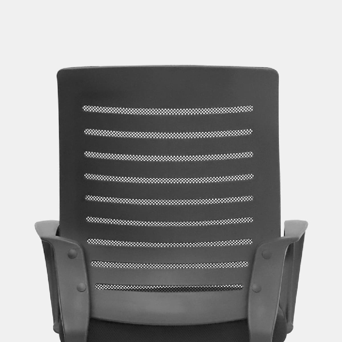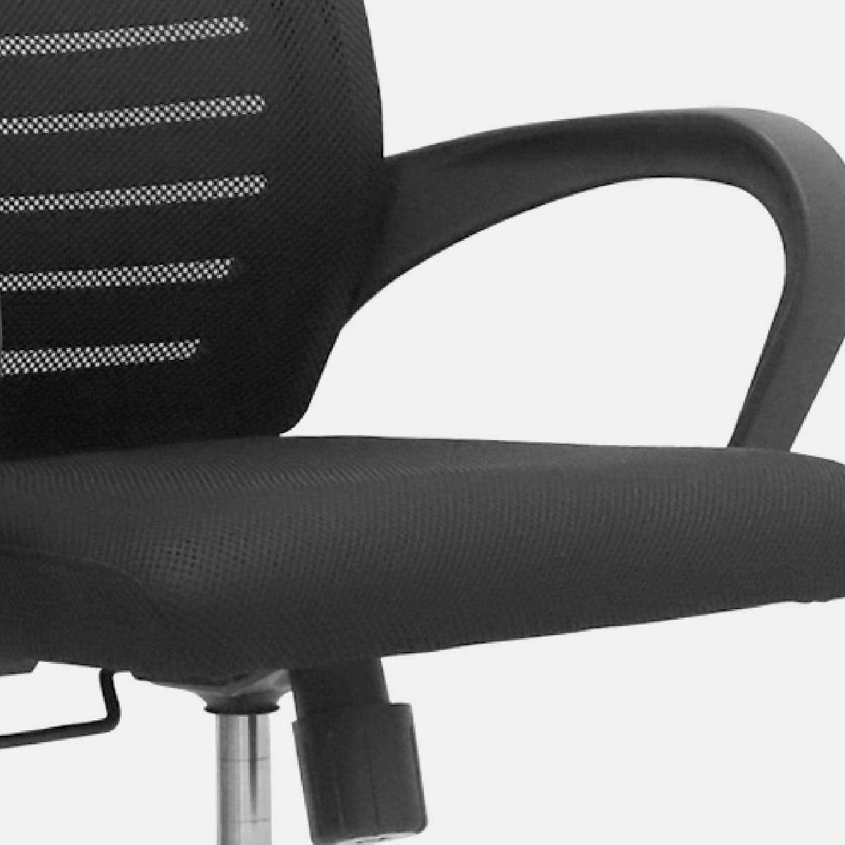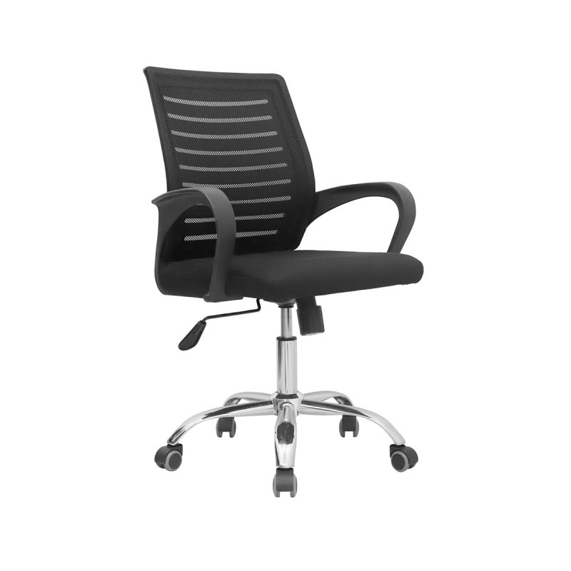 • Espaldar en malla poliester • Brazos en polipropileno, fijos • Asiento en espuma laminada con tapizado textil • Mecanismo basculante 1 bloqueo con perilla de tensión • Base cromada 300 mm • Ruedas nylon 50 mm